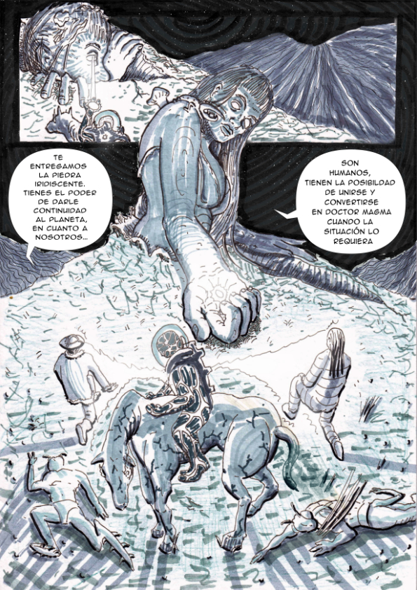 I made the drawing s for Comic adaptation "9.81, a film written and directed by Norman Briski", presented at the National Library by Editorial Daperttuto; the Web Comic series: The Mountain, Crab, Elephant of plasticine and DR. Magama, Force of lava (Comprehensive author).