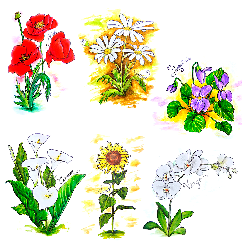 FLORES ZODIACALES: Aries, Tauro, Géminis, Cáncer, Leo, Virgo - Brush Pen